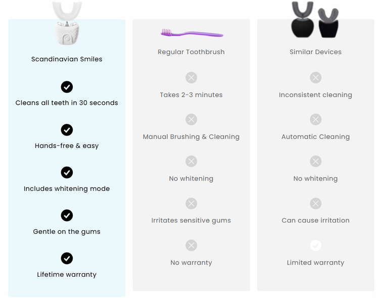 Our Scandinavian Smiles brush is a fully automatic, 30-second solution that deep-cleans every tooth, whitens gently with cold light, and promotes gum health — giving you a cleaner, fresher smile with zero effort.